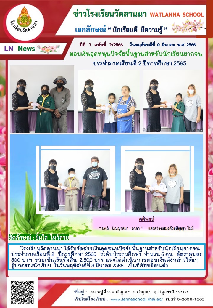 มอบเงินอุดหนุนปัจจัยพื้นฐานสำหรับนักเรียนยากจน ภาคเรียนที่ 2 ปีการศึกษา 2565