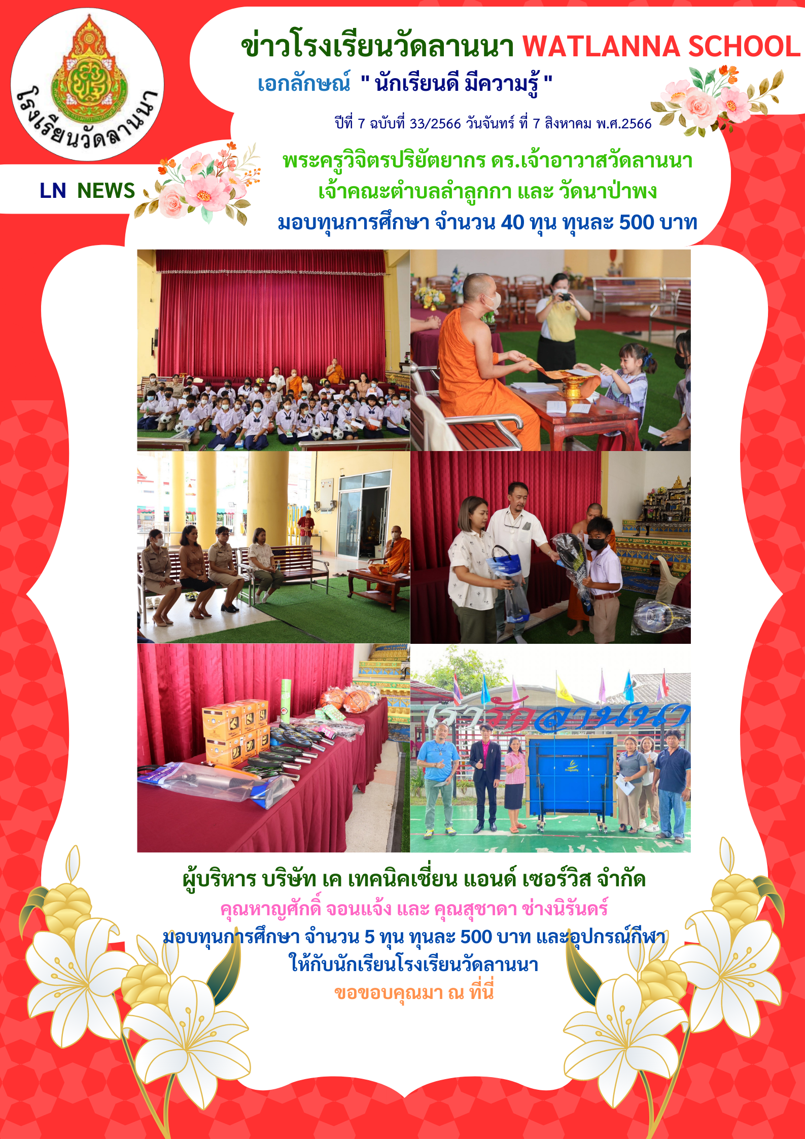 คณะครู นักเรียนโรงเรียนวัดลานนา ขอกราบขอบพระคุณ พระครูวิจิตรปริยัตยากร ดร.เจ้าอาวาสวัดลานนา เจ้าคณะตำบลลำลูกกา และ วัดนาป่าพง มอบทุนการศึกษา จำนวน 40 ทุน และ คุณหาญศักดิ์ จอนแจ้ง และ คุณสุชาดา ช่างนิรันดร์ จาก บริษัท เค เทคนิคเชี่ยน แอนด์ เซอร์วิส จำกัด มอบทุนการศึกษา จำนวน 5 ทุน และ อุปกรณ์กีฬา ให้กับนักเรียนโรงเรียนวัดลานนา ในวันจันทร์ที่ 7 สิงหาคม 2566