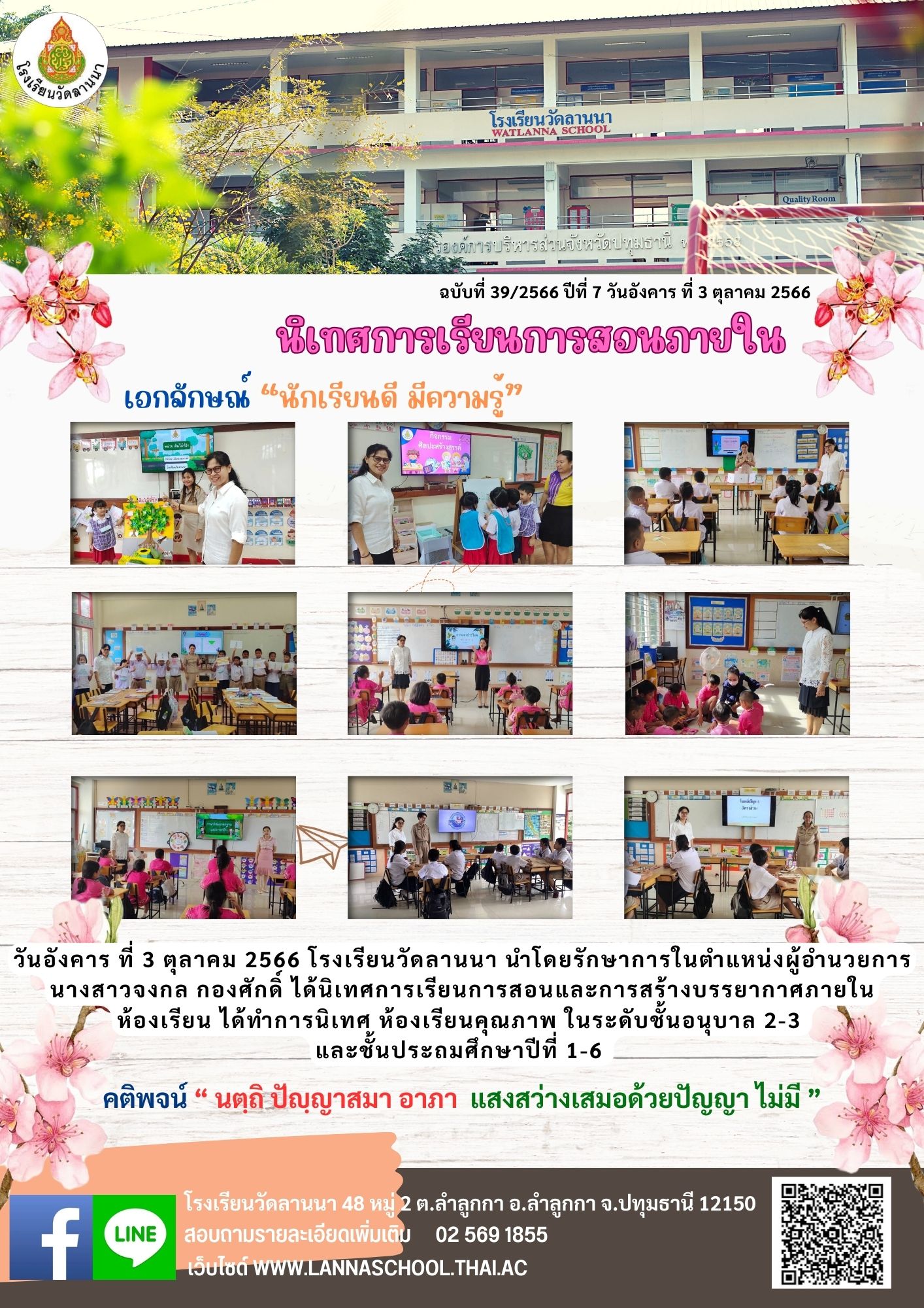 เมื่อวันอังคาร ที่ 3 ตุลาคม 2566 โรงเรียนวัดลานนา นำโดยรักษาการในตำแหน่งผู้อำนวยการ นางสาวจงกล กองศักดิ์ ได้นิเทศการเรียนการสอนและการสร้างบรรยากาศภายในห้องเรียน ได้ทำการนิเทศ ห้องเรียนคุณภาพ ในระดับชั้นอนุบาล 2-3 และชั้นประถมศึกษาปีที่ 1-6