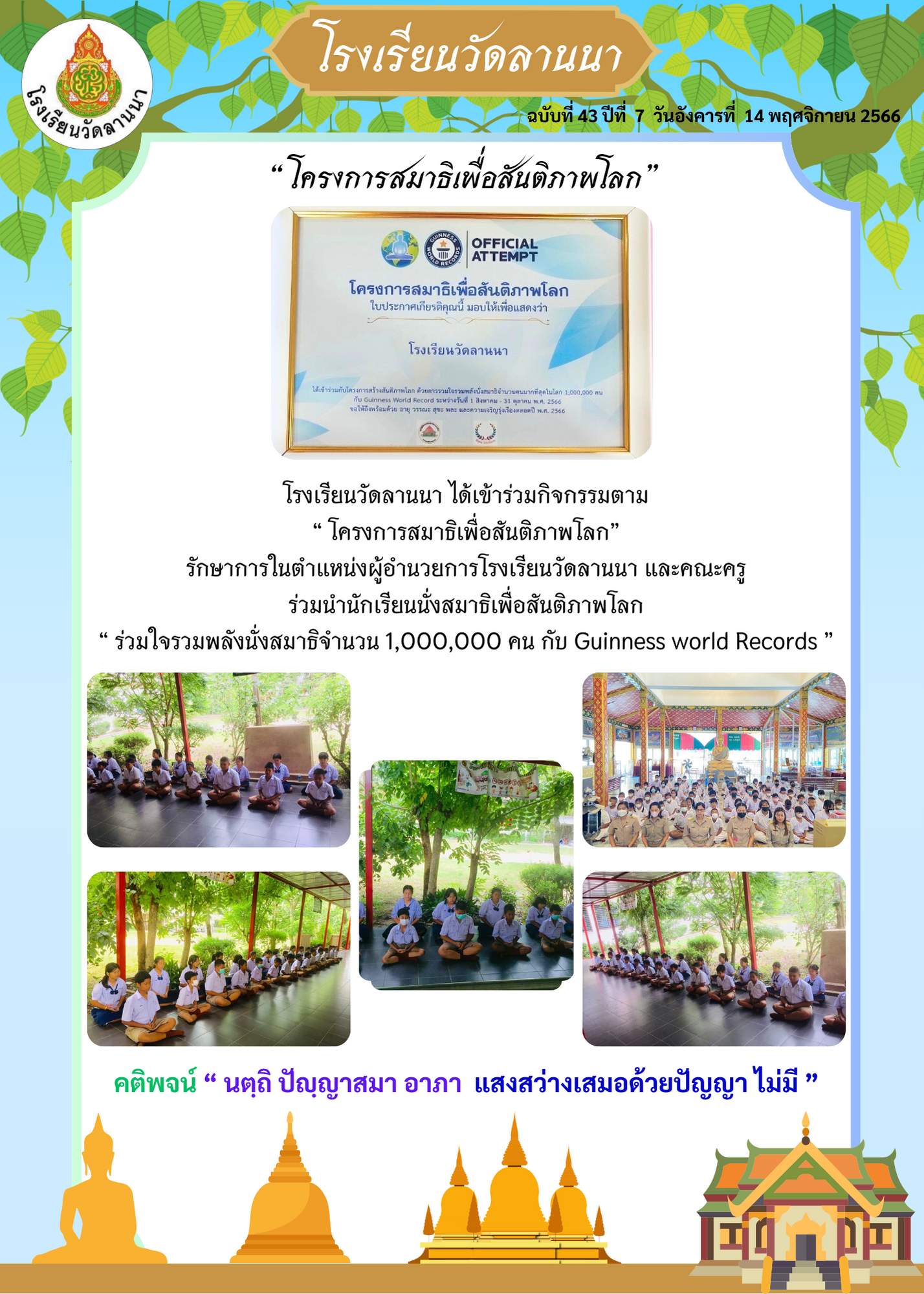 ร่วมนำนักเรียนนั่งสมาธิเพื่อสันติภาพโลก “ ร่วมใจรวมพลังนั่งสมาธิจำนวน 1,000,000 คน กับ Guinness world Records ”