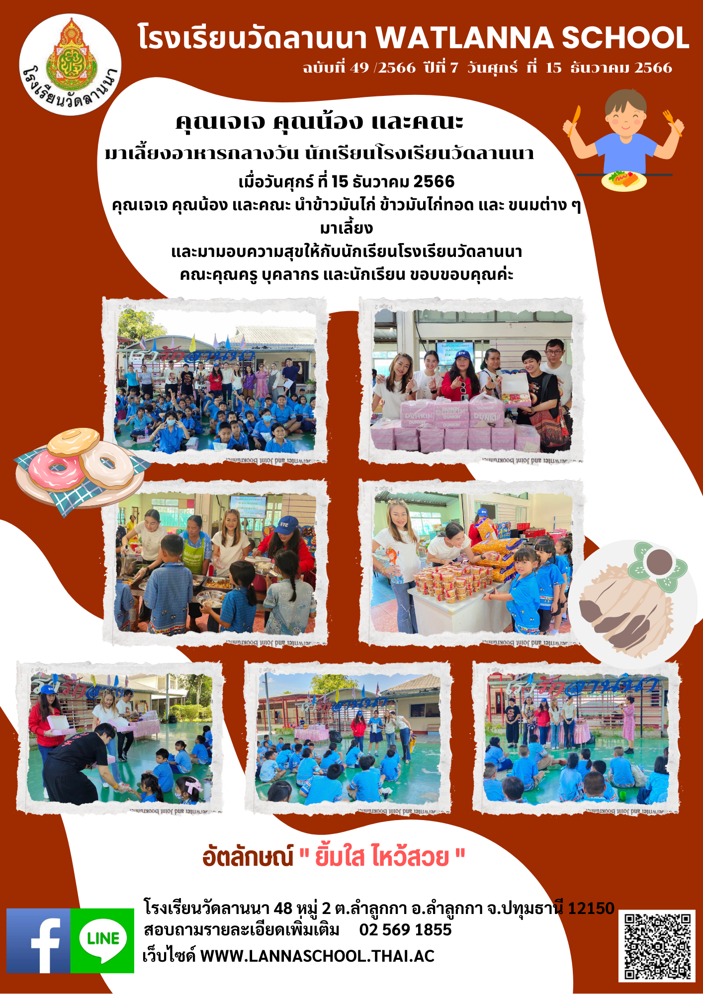 เมื่อวันศุกร์ ที่ 15 ธันวาคม 2566 นางสาวจงกล กองศักดิ์ รักษาการในตำแหน่งผู้อำนวยการโรงเรียนวัดลานนา คณะครู และนักเรียน โรงเรียนวัดลานนา ขอขอบคุณ คุณเจเจ คุณน้อง และคณะ ที่นำข้าวมันไก่ ข้าวมันไก่ทอด และ ขนมต่าง ๆ มาเลี้ยง และมามอบความสุขให้กับนักเรียนโรงเรียนวัดลานนา
