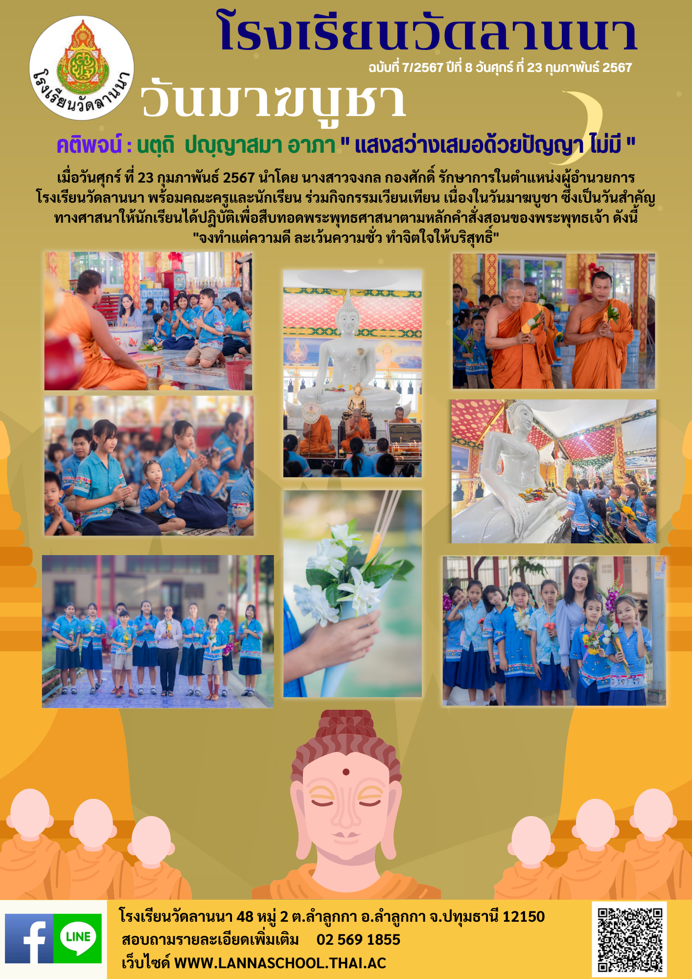 เมื่อวันศุกร์ ที่ 23 กุมภาพันธ์ 2567 นำโดย นางสาวจงกล กองศักดิ์ รักษาการในตำแหน่งผู้อำนวยการโรงเรียนวัดลานนา พร้อมคณะครูและนักเรียน ร่วมกิจกรรมเวียนเทียน เนื่องในวันมาฆบูชา ซึ่งเป็นวันสำคัญทางศาสนาให้นักเรียนได้ปฎิบัติเพื่อสืบทอดพระพุทธศาสนาตามหลักคำสั่งสอนของพระพุทธเจ้า ดังนี้ "จงทำแต่ความดี ละเว้นความชั่ว ทำจิตใจให้บริสุทธิ์"