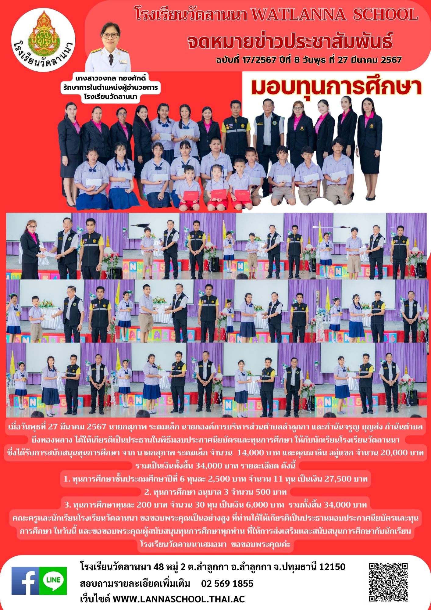 ซึ่งได้รับการสนับสนุนทุนการศึกษา จาก นายกสุภาพ ระดมเล็ก จำนวน 14,000 บาท และคุณมาลิน อยู่แขก จำนวน 20,000 บาท รวมเป็นเงินทั้งสิ้น 34,000 บาท รายละเอียด ดังนี้