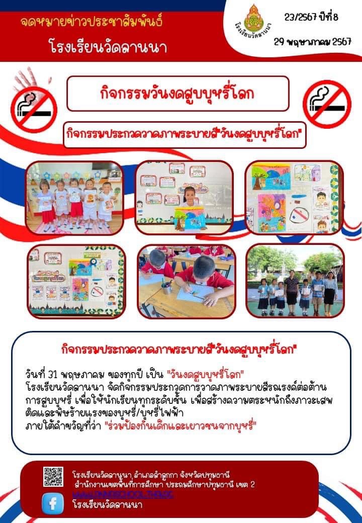 นางสาวจงกล กองศักดิ์ รักษาการในตำแหน่งผู้อำนวยการโรงเรียนวัดลานนา พร้อมคณะครูและ นักเรียนโรงเรียนวัดลานนา ได้ดำเนินการจัดกิจกรรมรณรงค์ต่อต้านการสูบบุหรี่ ขับเคลื่อนเดินรณรงค์ การป้องกันควบคุมบุหรี่/บุหรี่ไฟฟ้าในกลุ่มเด็กและเยาวชน โดยการจัดกิจกรรมเนื่องในสัปดาห์วันงดสูบบุหรี่โลกเพื่อป้องกันมิให้เกิดผู้เสพยาสูบรายใหม่ และป้องกันนักสูบหน้าใหม่ โดยการให้ความรู้ ความตระหนักถึงภาวะเสพติดและพิษร้ายแรงของบุหรี่/บุหรี่ไฟฟ้า