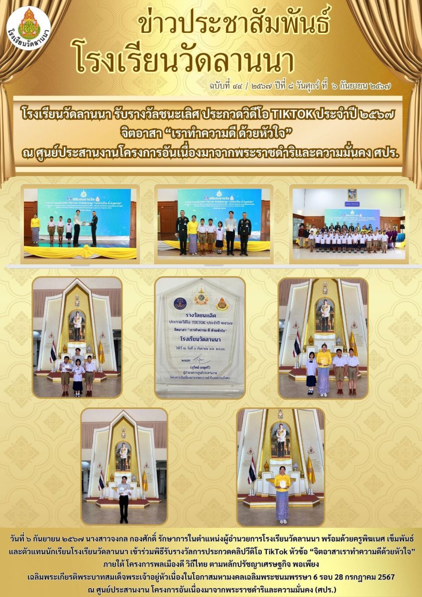 วันที่ ๖ กันยายน ๒๕๖๗ นางสาวจงกล กองศักดิ์ รักษาการในตำแหน่งผู้อำนวยการโรงเรียนวัดลานนา พร้อมด้วยครูพิฆเนศ เข็มพันธ์ และตัวแทนนักเรียนโรงเรียนวัดลานนา ได้รับรางวัลชนะเลิศ ระดับคุณภาพดีเยี่ยม ในการประกวดคลิปวีดิโอ TikTok หัวข้อ “จิตอาสาเราทำความดีด้วยหัวใจ” ภายใต้ โครงการพลเมืองดี วิถีไทย ตามหลักปรัชญาเศรษฐกิจ พอเพียง