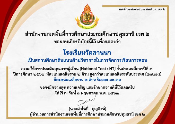 โรงเรียนวัดลานนา เป็นสถานศึกษาต้นแบบด้านวิชาการในการจัดการเรียนการสอน ส่งผลให้การประเมินคุณภาพผู้เรียน (National Test : NT) ชั้นประถมศึกษาปีที่ 3 ปีการศึกษา 2566 มีคะแนนเฉลี่ยรวม ๒ ด้าน สูงกว่าคะแนนเฉ