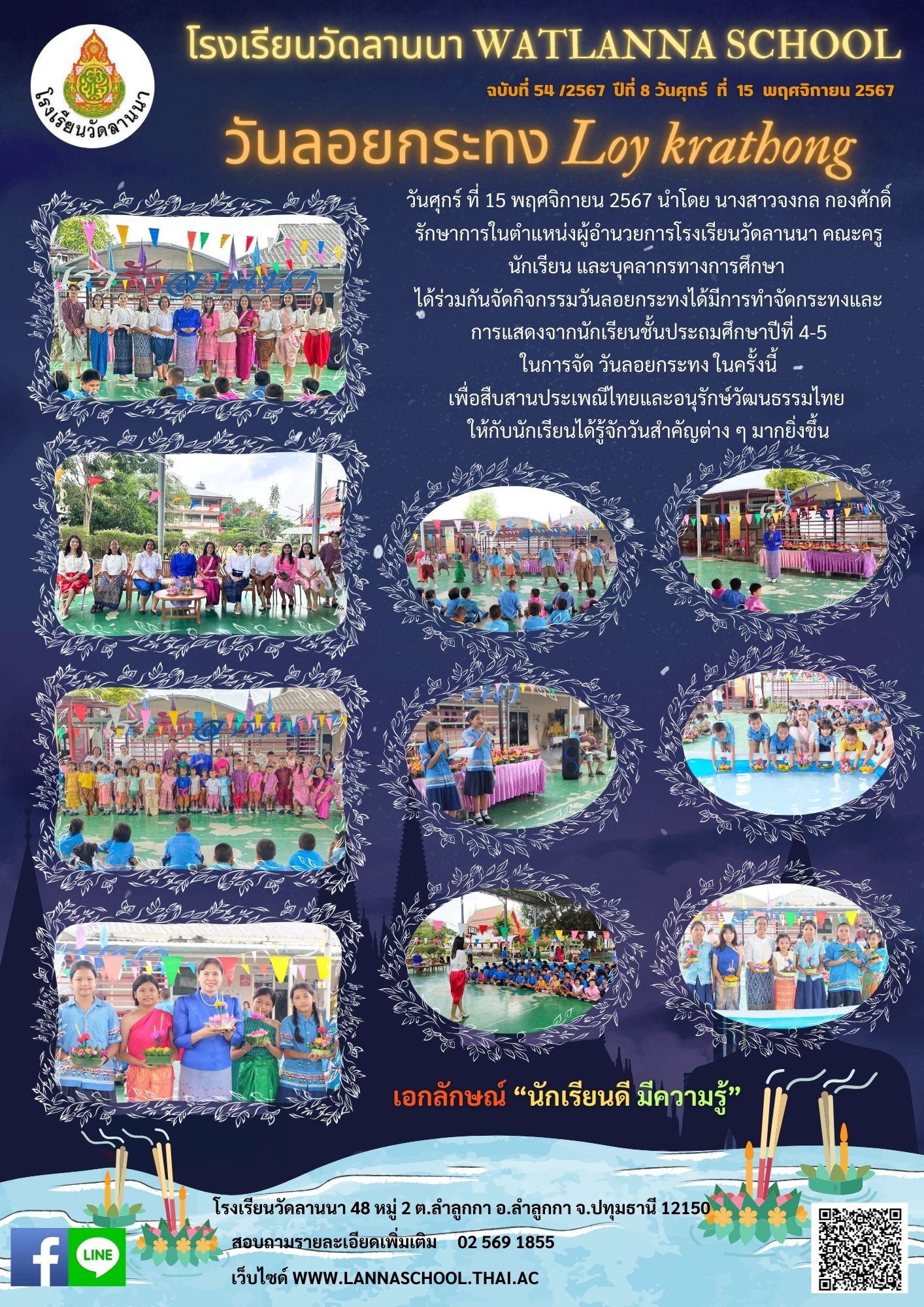 วันศุกร์ ที่ 15 พฤศจิกายน 2567 นำโดย นางสาวจงกล กองศักดิ์ รักษาการในตำแหน่งผู้อำนวยการโรงเรียนวัดลานนา คณะครูนักเรียน และบุคลากรทางการศึกษา ได้ร่วมกันจัดกิจกรรมวันลอยกระทง