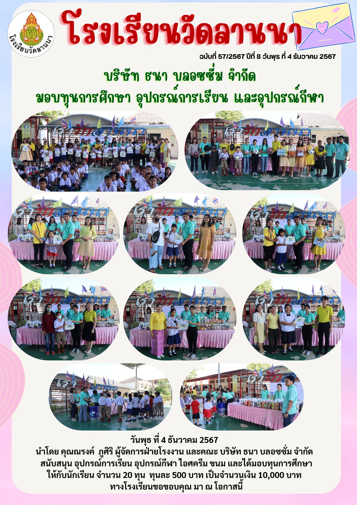 คุณณรงค์ ภูศิริ ผู้จัดการฝ่ายโรงงาน และคณะ บริษัท ธนา บลอซซั่ม จำกัด สนับสนุน อุปกรณ์การเรียน อุปกรณ์กีฬา ไอศครีม ขนม และได้มอบทุนการศึกษา ให้กับนักเรียน จำนวน 20 ทุน ทุนละ 500 บาท เป็นจำนวนเงิน 10,0
