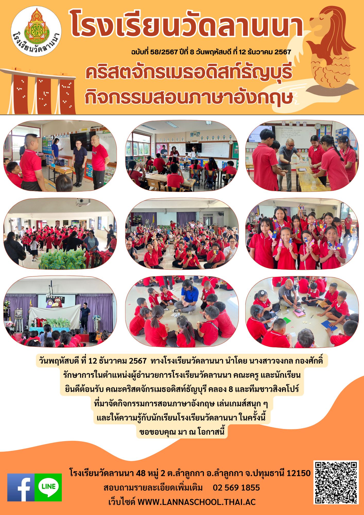 ยินดีต้อนรับ คณะคริสตจักรเมธอดิสท์ธัญบุรี คลอง 8 และทีมชาวสิงคโปร์ ที่มาจัดกิจกรรมการสอนภาษาอังกฤษ เล่นเกมส์สนุก ๆ และให้ความรู้กับนักเรียนโรงเรียนวัดลานนา
