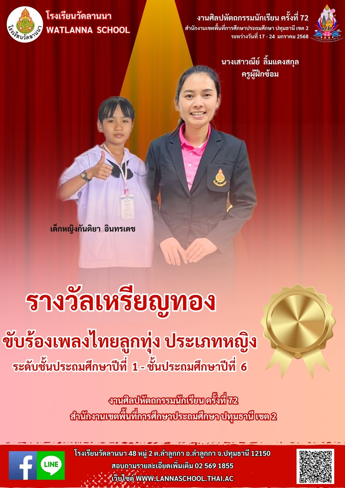 การแข่งขันขับร้องเพลงไทยลูกทุ่ง ประเภทหญิง ป.1 - ป.6 ระดับเหรียญทอง งานศิลปหัตถกรรมนักเรียน ครั้งที่ 72