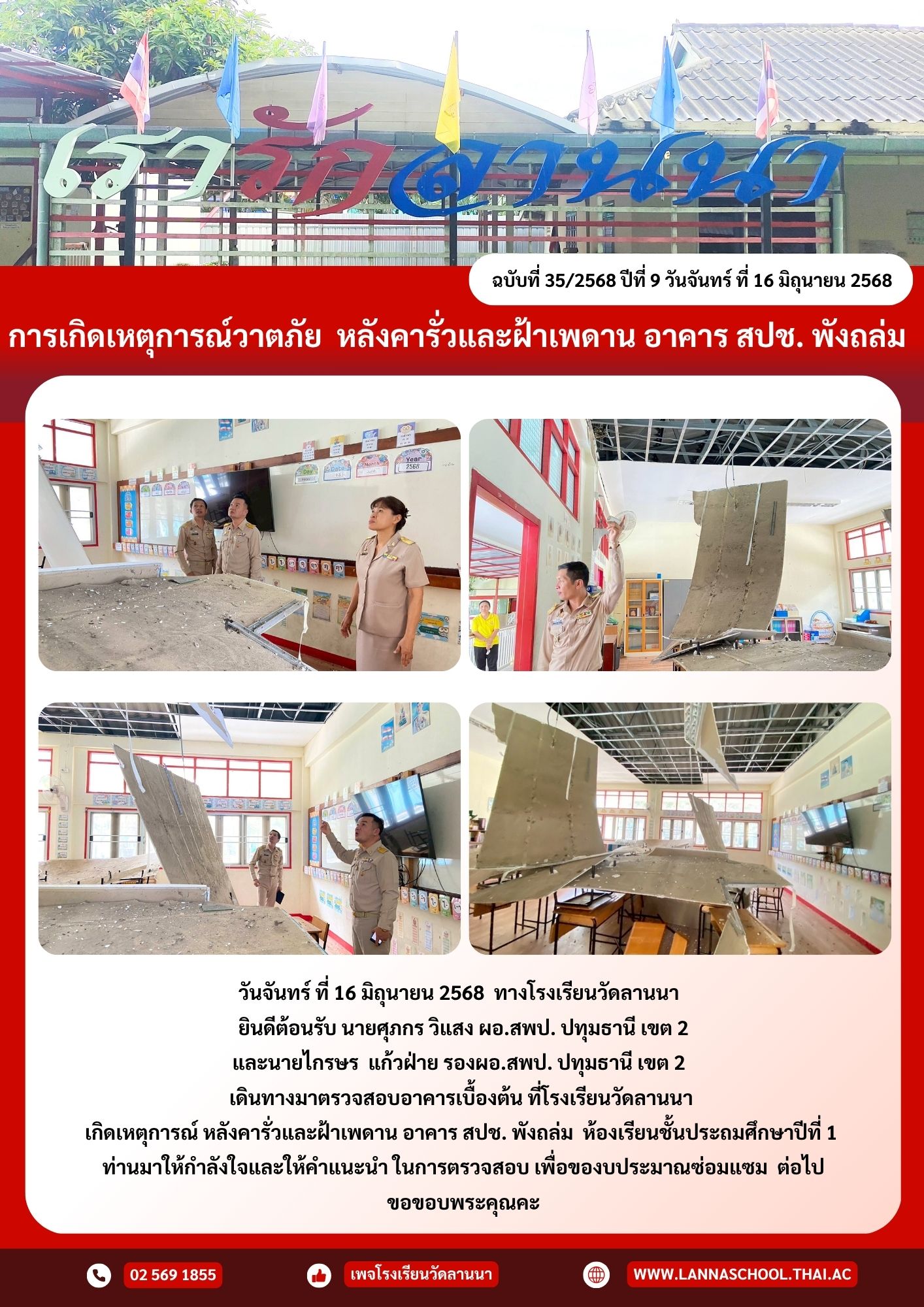 โรงเรียนวัดลานนา เกิดเหตุการณ์ หลังคารั่วและฝ้าเพดาน อาคาร สปช. พังถล่ม ห้องเรียนชั้นประถมศึกษาปีที่ 1